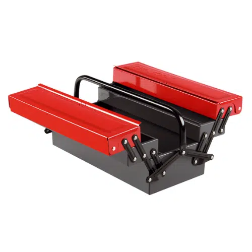 La caisse à outils est dépliante pour un accès aux outils rapide et facile. Grande capacité de stockage et construction en acier avec revêtement anti rayure. Fermoir pour cadenas