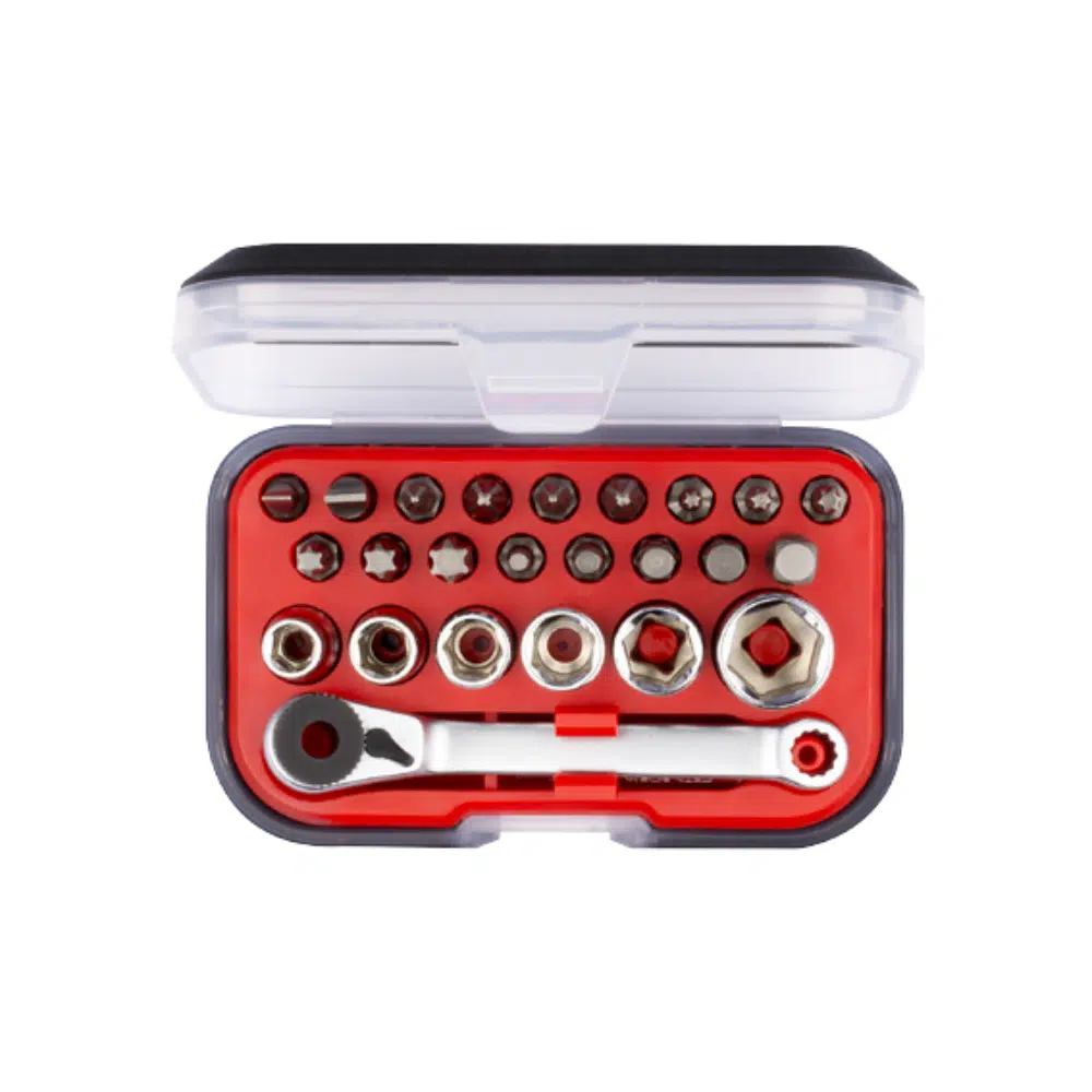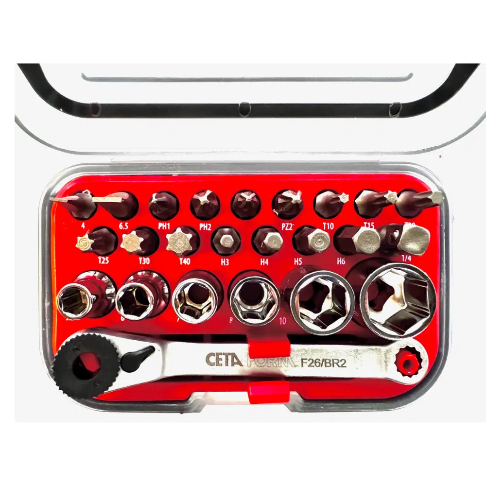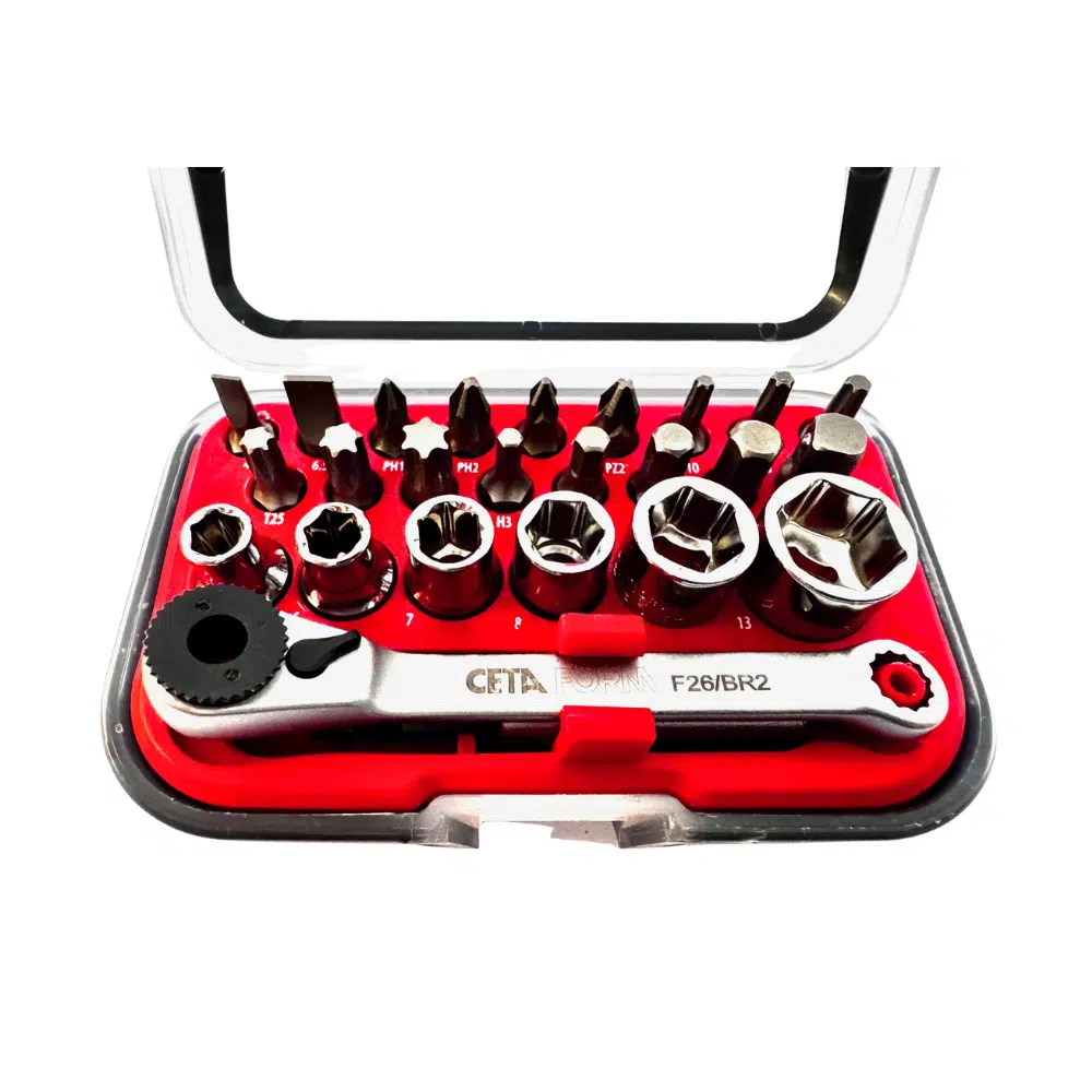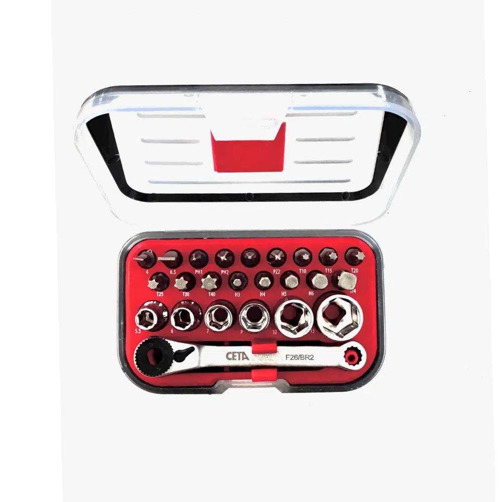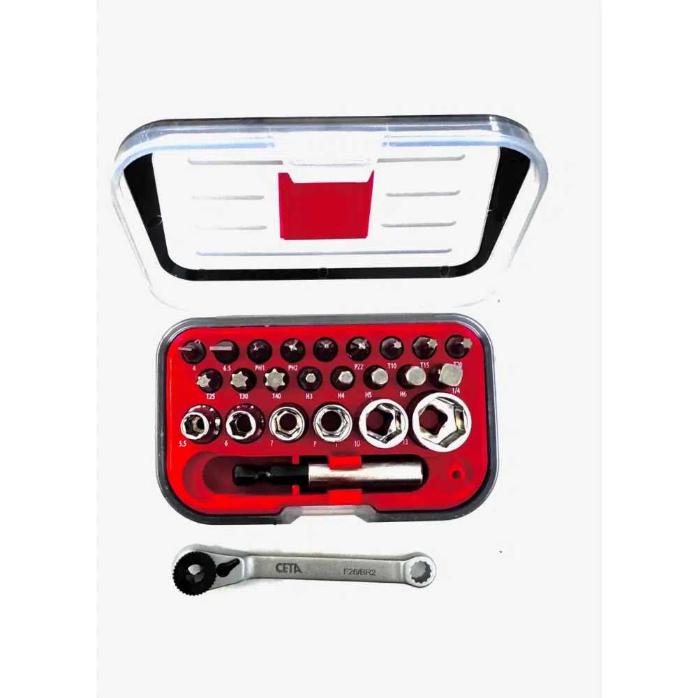 Compact et complet, le coffret Cetaform CB/ST25 réunit 25 pièces indispensables pour vos travaux de vissage et de maintenance. En effet, grâce à son format mini et son cliquet réversible 1/4’’, il vous accompagne partout, que ce soit en atelier, en mécanique automobile ou encore pour le bricolage quotidien.