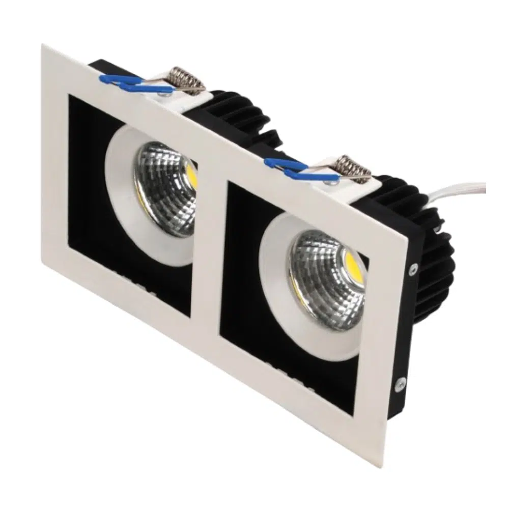 Le Double spot LED downlight blanc 2x8W (Eq. 2x64W) 6400K Dim. 185x100mm est à la fois esthétique et robuste. Il conviendra parfaitement pour type d’application commerciale, restaurants, hôtels, magasins etc… mais également pour une application domestique. Ces 2 spots orientables permettront de cibler l’éclairage sur une vitrine, un objet etc.. Pour son installation, vous devez disposez d’un faux plafond avec une profondeur de 130mm minimum pour pouvoir encastrer le spot et le fondre dans le décor. Le diamètre de découpe est de 81x170mm. Avec de très faible consommation d’énergie et une très longue durée de vie, vous réaliserez de réelles économies. Spot vendu avec son transformateur. Grâce à son rendement énergétique élevé, ce double spot possède une classe énergétique A++ à A. Produit conforme à la norme CE, à la directive RoHS et DEEE.