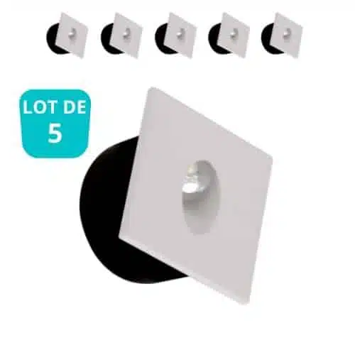 Le lot de 5 Spots LED muraux carré blanc 3W 4000K permet de baliser les marches d’un escalier ou les couloirs, avec un rendu esthétique moderne. Le diamètre de découpe des spots est de 65mm. Avec de très faibles consommations d’énergies et une très longue durée de vie, vous réalisez de réelles économies. En effet, la puissance de 3W LED correspondent à 25W incandescent. Les spots LED muraux carré blanc 3W 4000K sont vendus avec un socle d’encastrement qui protège le mécanisme et le transformateur inclus. Le diffuseur est en verre et il dirige la lumière vers le bas.