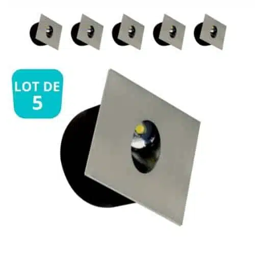 Le lot de 5 Spots LED muraux carré mat chrome 3W 4000K permet de baliser les marches d’un escalier ou les couloirs, avec un rendu esthétique moderne. Le diamètre de découpe des spots est de 65mm. Avec de très faibles consommations d’énergies et une très longue durée de vie, vous réalisez de réelles économies. En effet, la puissance de 3W LED correspondent à 25W incandescent. Les spots LED muraux carré mat chrome 3W 4000K sont vendus avec un socle d’encastrement qui protège le mécanisme et le transformateur inclus. Le diffuseur est en verre et il dirige la lumière vers le bas.