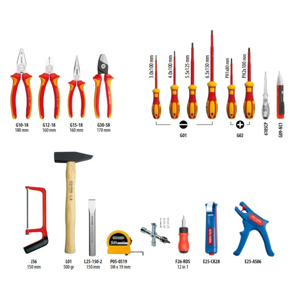 Chaque outil est soigneusement sélectionné pour couvrir l’ensemble des besoins du quotidien : coupe, serrage, vissage, mesure, dénudage et test électrique. Les poignées ergonomiques, l’isolation certifiée VDE, et la qualité de l’acier forgé assurent une prise en main confortable, une longévité exceptionnelle et une efficacité optimale, même en conditions intensives.