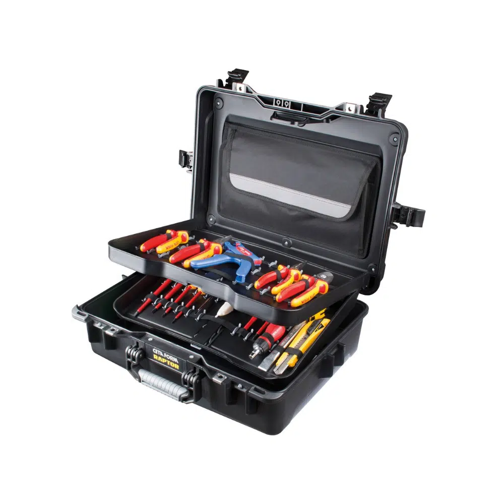 Bonne durabilité : mallette robuste (modèle Raptor) et organisation pratique des outils.