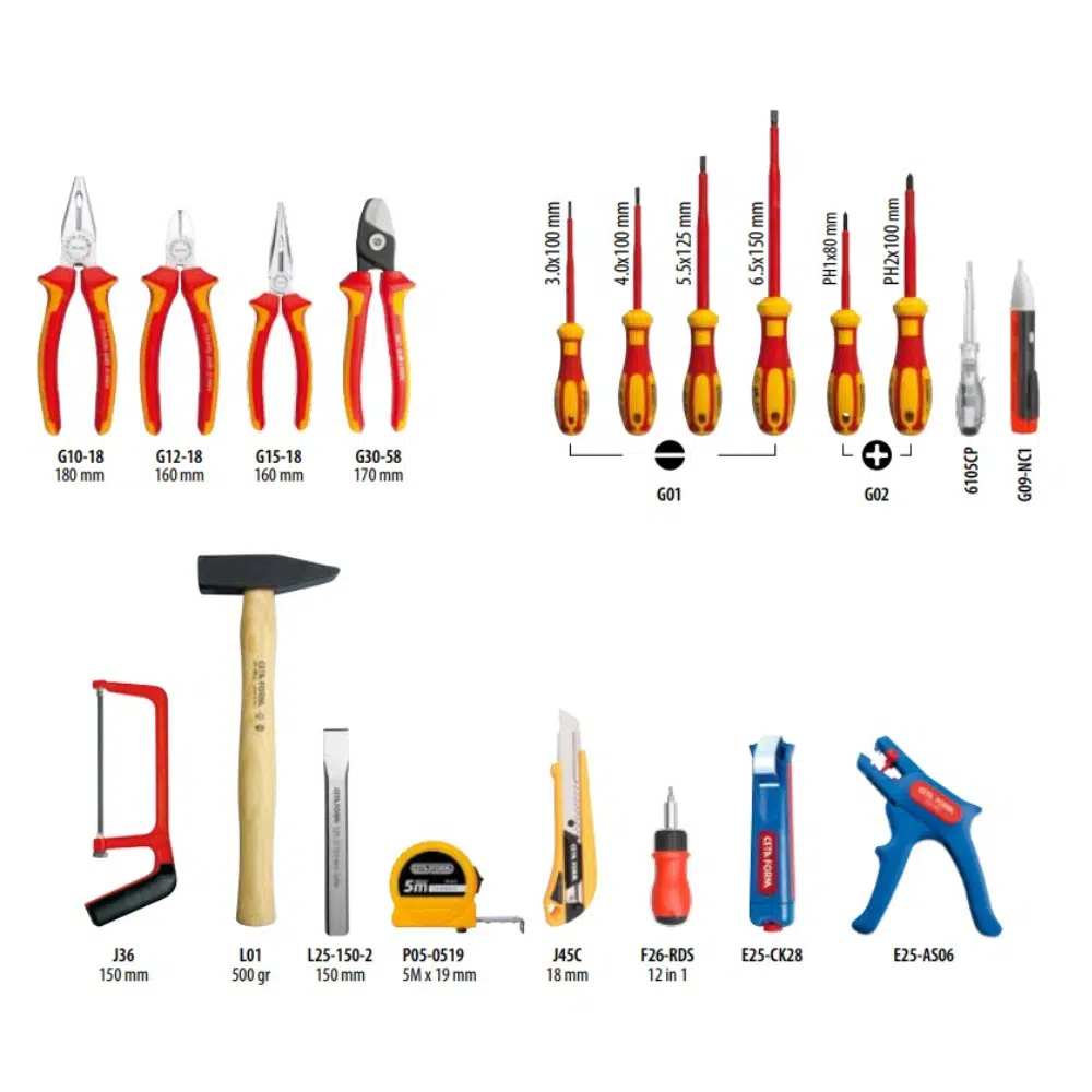 Chaque outil est soigneusement sélectionné pour couvrir l’ensemble des besoins du quotidien : coupe, serrage, vissage, mesure, dénudage et test électrique. Les poignées ergonomiques, l’isolation certifiée VDE, et la qualité de l’acier forgé assurent une prise en main confortable, une longévité exceptionnelle et une efficacité optimale, même en conditions intensives.