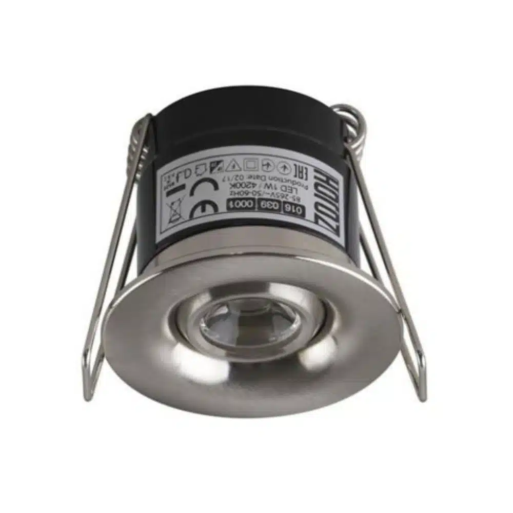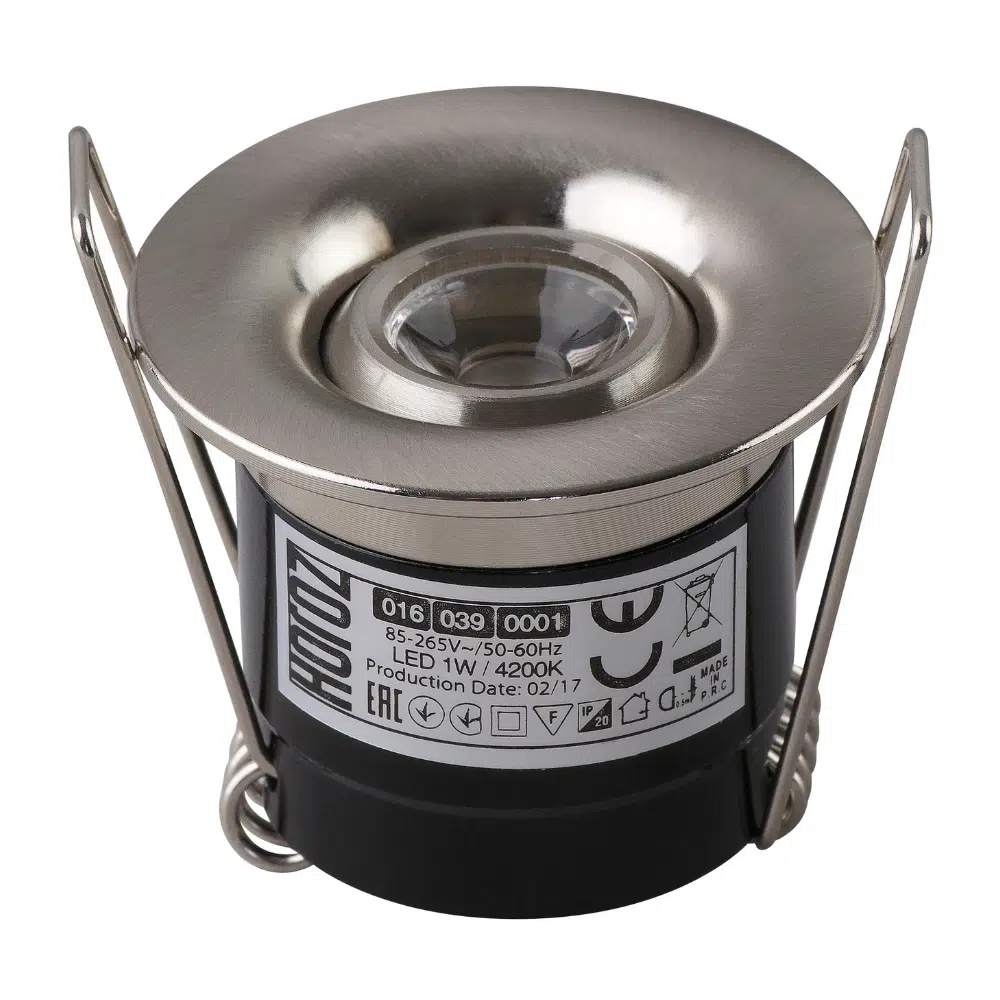 Pour l’installation du mini spot LED 1W orientable rond mat chrome, vous devez disposez d’un faux plafond avec une profondeur de 50mm minimum pour pouvoir encastrer le spot. Le diamètre de découpe est de 32mm.