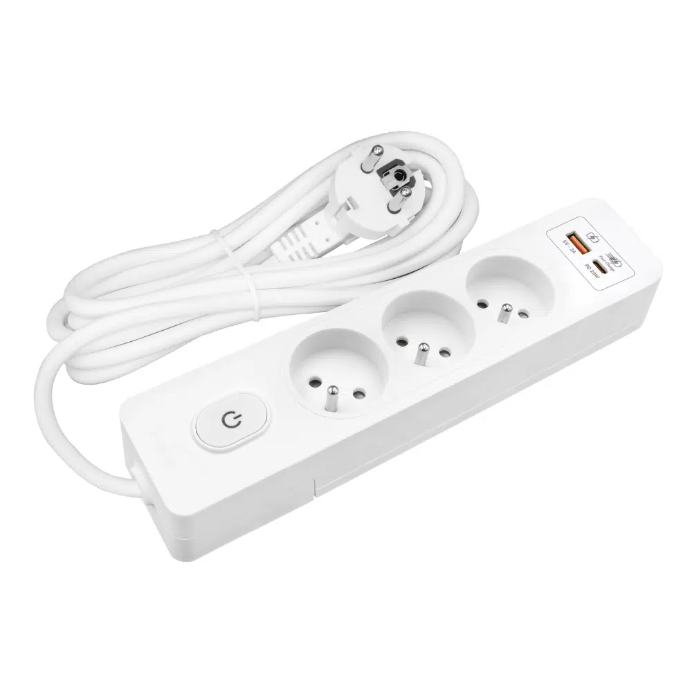 La multiprise SELDUR G3FH22B, avec ses 3 prises 2P+T et protection enfant, permet de brancher simultanément trois appareils électriques. Elle dispose également de ports USB A et USB C pour la charge rapide des appareils électroniques.
