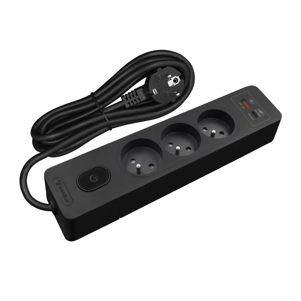 La multiprise SELDUR G3FH32S, avec ses 3 prises 2P+T et protection enfant, permet de brancher simultanément trois appareils électriques. Elle dispose également de ports USB A et USB C pour la charge rapide des appareils électroniques.