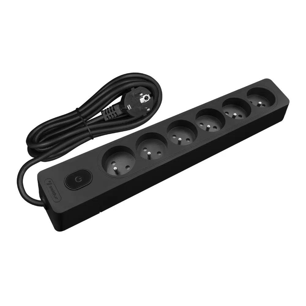 La multiprise SELDUR G6FA22S, avec ses 6 prises 2P+T et protection enfant, permet de brancher simultanément trois appareils électriques.