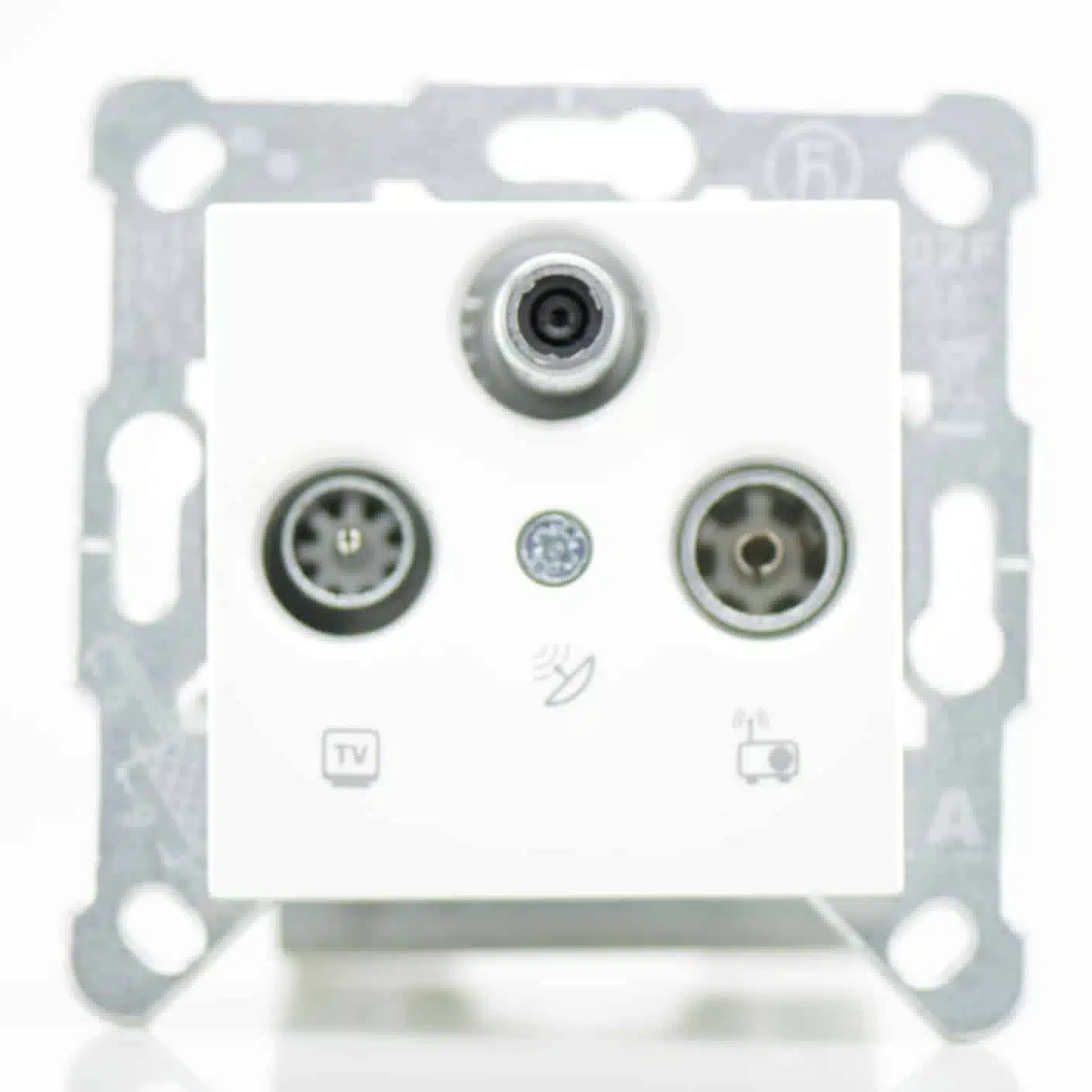 Cette prise TV FM SAT blanc – (Méca+touche) Gamme Karre Novella comprend le mécanisme et le bouton. Vous n’avez plus qu’à l’associer avec une plaque décorative (plastique, bois massif, métal, verre ou corian) pour obtenir un appareillage complet. Pour réception hertzienne et satellite, cet appareillage est doté d’une prise TV d’une prise Radio et d’une prise Satellite. Le spectre des fréquences est de 5-2400 Mhz et il est équipé d’un filtre contre les interférences.Bandes de fréquences : TV 47-68 Mhz VHF 1 – 120-862 MHz VHF3 UHF, FM 87.5-108 MHz, SAT 950-2400 MHZ. Les appareillages VIKO sont modernes, robustes et élégants avec des lignes droites et précises. Doté de bornes automatiques, la connexion des fils se fait sans tournevis pour une installation simple et rapide. Produits homologués aux normes NF et CE.