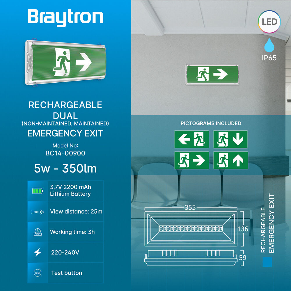 Le modèle BC14-00900 est une signalétique de sortie LED 5W conçue pour assurer une visibilité optimale des voies d’évacuation grâce à sa luminosité élevée de 350 lumens et sa température de couleur blanc froid (6500K).