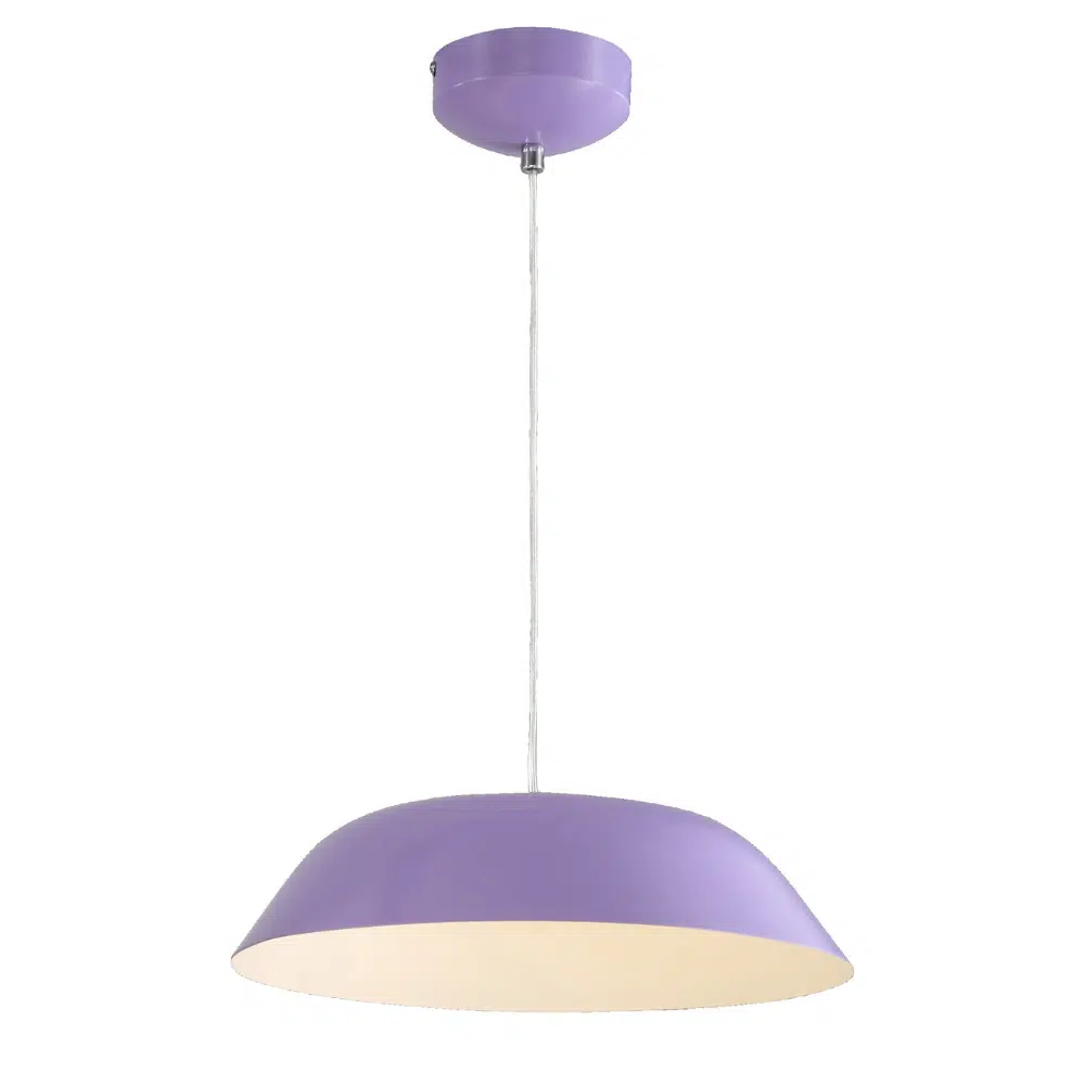 Cette suspension LED gamelle violet 6W (Eq. 48W) Diam. 350mm rappelle le design des anciennes suspensions industrielle tout en offrant des couleurs vives pour s’accorder à la déco intérieur de vos pièces à vivres. Dotée de LED intégrées offrant de très faible consommation et une très longue durée de vie, cette suspension LED trouvera aisément sa place au dessus d’une table à manger, au centre de votre salon, un bureau ou même une chambre. Plusieurs montages sont possible en fonction de la taille de la pièce, l’espace à éclairer et l’aspect décoratif recherché. Montage individuel, en série de manière linéaire ou groupé en cascade en utilisant différentes hauteurs de cordons. Cette suspension est conforme à la norme CE, à la directive RoHS et DEEE. Grâce à son rendement énergétique élevé, elle possède une classe énergétique A à A++. Application domestique ou commerciale.